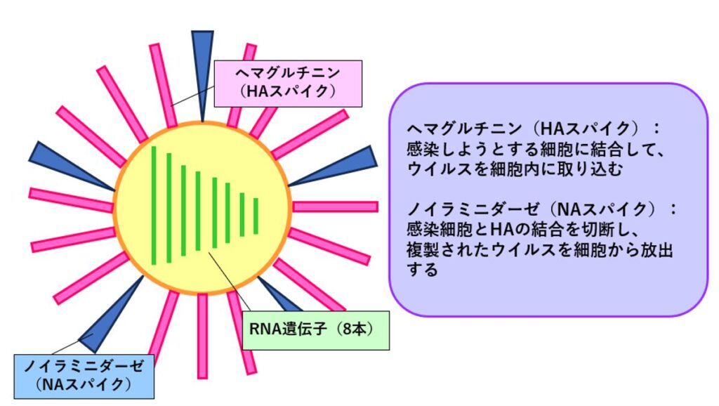 ヒトに対して多くの感染を起こすのは、A型ウイルスです。ウイルス表面の2つの抗原、ヘマグルチニン(HA;16種類)とノイラミニダーゼ(NA;9種類)によって144の亜型に分類されます。