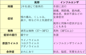 こうしてみると、流行の時期や症状の出方、原因となるウイルスなど様々な違いがあることがわかります。インフルエンザの方が急な全身症状が現れ、合併症のリスクもあるため、風邪よりも重篤であるといえます。